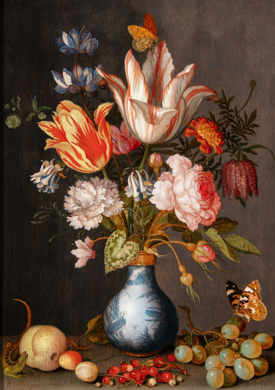 The bouquet is carefully composed of flowers from spring and summer, and finely painted layer by layer. It stands against a dark background in a Chinese blue and white vase of so-called crackling porcelain. In the bouquet we recognize roses, clematis, a white carnation, pink cyclamen, blue and white aquilegia, motherwort and a few sprigs of rosemary. But most striking are the two hefty tulips, one red-yellow flamed and one red and white. A butterfly has landed on the latter tulip, which goes by the lovely name of emperor's mantle. A blue damselfly keeps itself near the aquilegia in semi-darkness. An atalanta sits on a bunch of grapes that lies on the plinth. On the far left is a lizard.