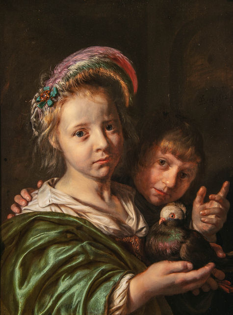 A girl and a boy, rendered in half, light up against a mysteriously dark background. The girl, with her large blue eyes in a perfectly flawless childlike face, looks at you earnestly. She holds a South German monk pigeon in her hand. The boy rests his right arm on the girl's shoulder, while his other hand points upward in a striking gesture.