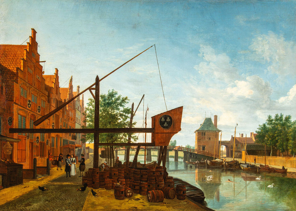 A view of a street along the Spaarne, the river that winds through Haarlem. On the right the Duck Gate or Leiden Watergate and in the distance, across the water, the meadows. An elegantly dressed couple chat with a man, while two servants bring out a beer barrel. A pair of chickens scurry around rows of stacked beer barrels on the quay. Brewery 'De Drie Klaveren' was located in the two houses left (now Spaarne 61 to 65b), clearly recognizable by the three clovers three on the facades. This sign is also on the wall, accessible with a ladder to the 'cabin' of the so-called capstan in the foreground and on a pair of beer barrels. With the capstan clean dune water from a ship could be brought into the brewery, while via the well gallows behind it, water was taken from the Spaarne.